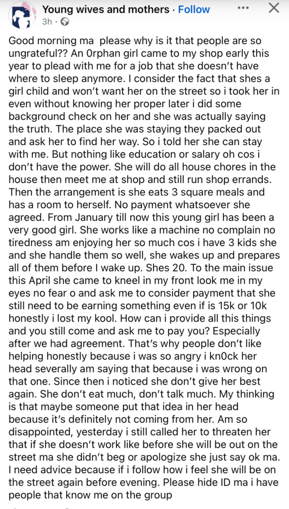 According to circulating accounts on social media, the woman claims she has been providing the child with food, shelter, and basic support, but was shocked when the girl allegedly demanded ₦10,000 in addition to her upkeep.