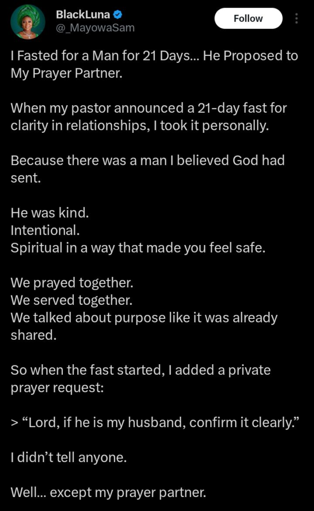 Her emotional statement captured the shock and disappointment she felt after the betrayal. “After 21 days of fasting for love, he proposed to my prayer partner,” she wrote.