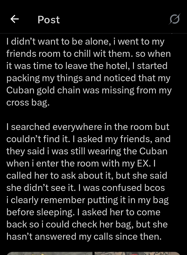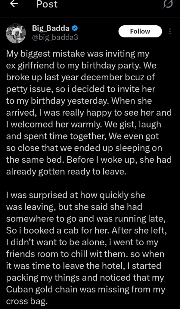 In a shocking turn of events, a man has found himself the victim of a brazen theft after inviting his ex-girlfriend to his birthday party. The man, who had arranged for a cab to transport her to the event, was left devastated when he realized his prized Cuban gold chain was missing—likely taken during her brief appearance at the celebration.