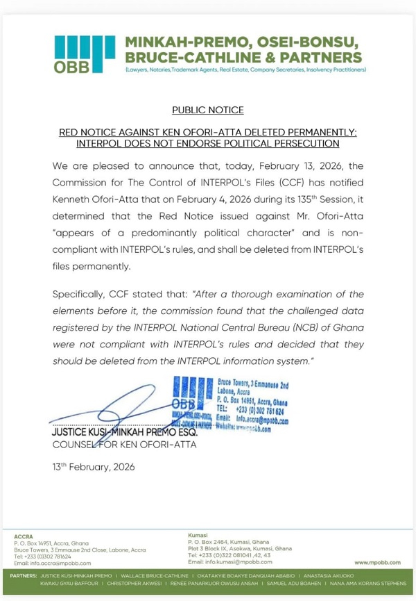 In a dramatic twist to one of Ghana’s most closely watched legal battles, INTERPOL has permanently deleted the Red Notice that had been issued against former Finance Minister Ken Ofori‑Atta, ruling the alert did not comply with its neutrality rules and was “predominantly political” in character.