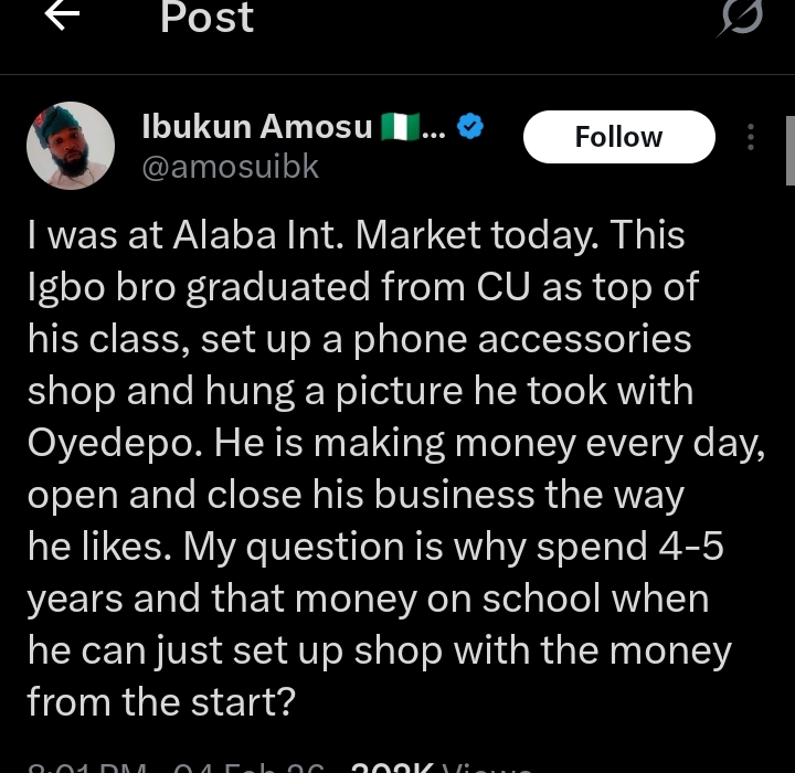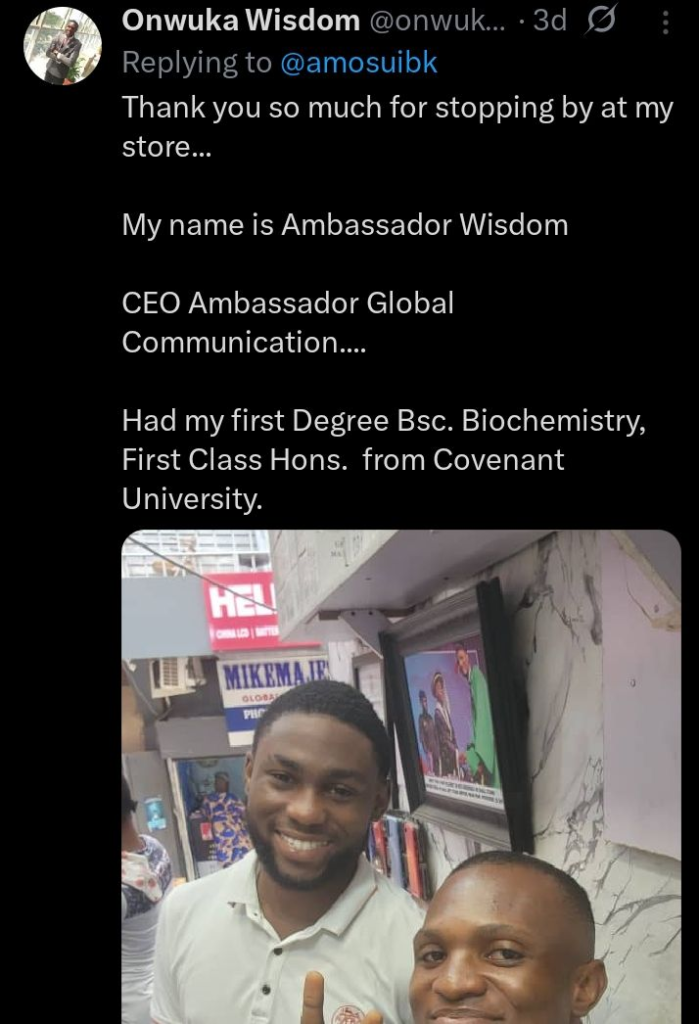 In a story that has left many shaking their heads in disbelief, a first-class Biochemistry graduate from Nigeria’s prestigious Covenant University is making headlines — not for a lab breakthrough, but for running a phone accessory store at a local market.