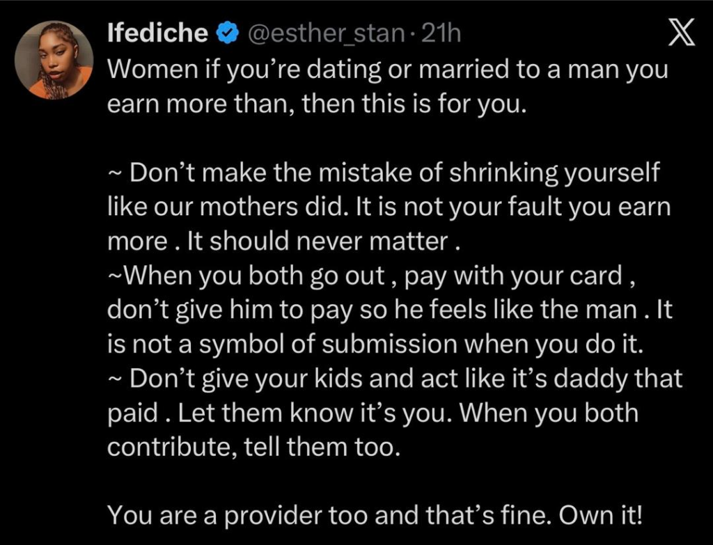 According to her, many women are pressured to downplay promotions, hide pay raises, or act smaller at home just to keep peace in their relationships. “If your success makes someone uncomfortable,” she implied, “that discomfort is not your responsibility.”