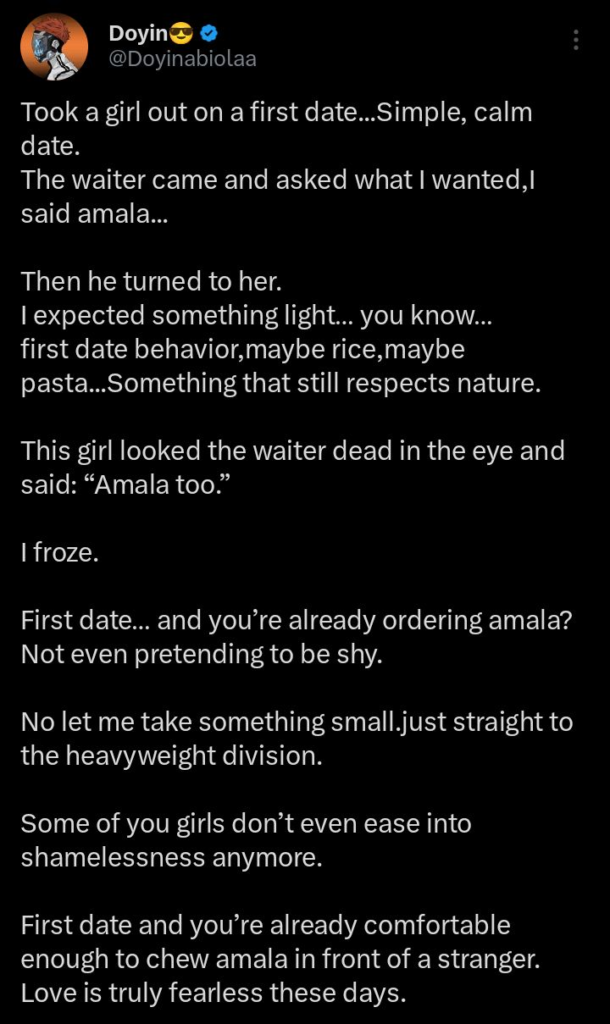 A seemingly ordinary first date quickly turned into a moment of utter surprise when a lady confidently ordered amala — a popular Nigerian delicacy — without a second thought, leaving her date wide-eyed and speechless.