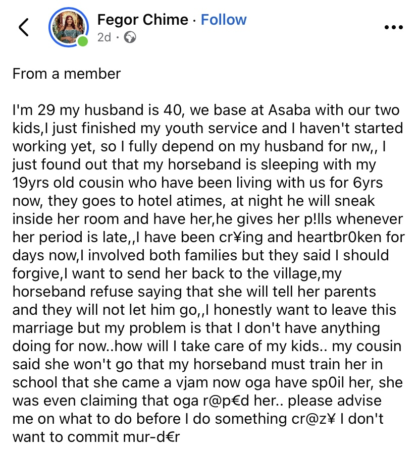 The allegation has ignited fierce reactions, with many expressing sympathy for the wife while condemning both the husband and the cousin — if the claims are true.