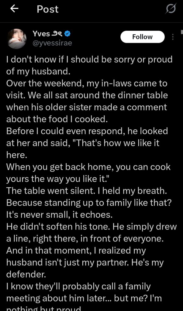 A woman has taken social media by storm after revealing her husband’s unforgettable reaction when his sister criticized her cooking. And according to her, the tension in the room was so thick “you could slice it with a knife.”