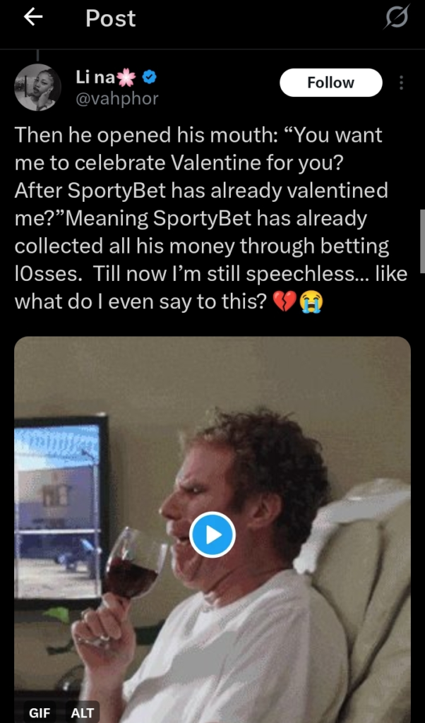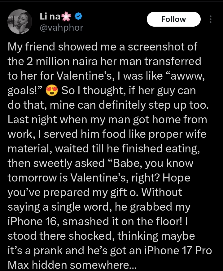 A woman has left social media buzzing after sharing the dramatic story of her boyfriend’s explosive reaction when she casually reminded him about her Valentine’s Day gift.
