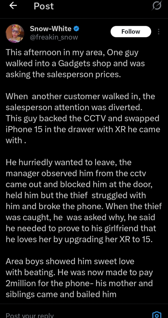 A surprising scene at a gadget shop has sparked conversations online after a lady shared the unexpected reason a man decided to swap his iPhone XR for another device.