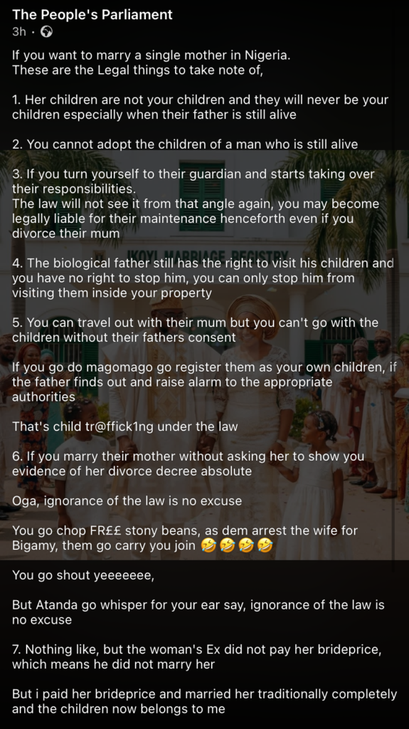 According to the lawyer, men must clearly understand the emotional and legal realities before stepping into such unions. His statement suggests that despite marriage, a stepfather may not automatically assume full parental rights — or recognition — over children from a previous relationship.
