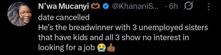 A romantic date has turned into a viral talking point after a woman reportedly cancelled plans with her lover upon learning he is financially responsible for three unemployed sisters and their children.