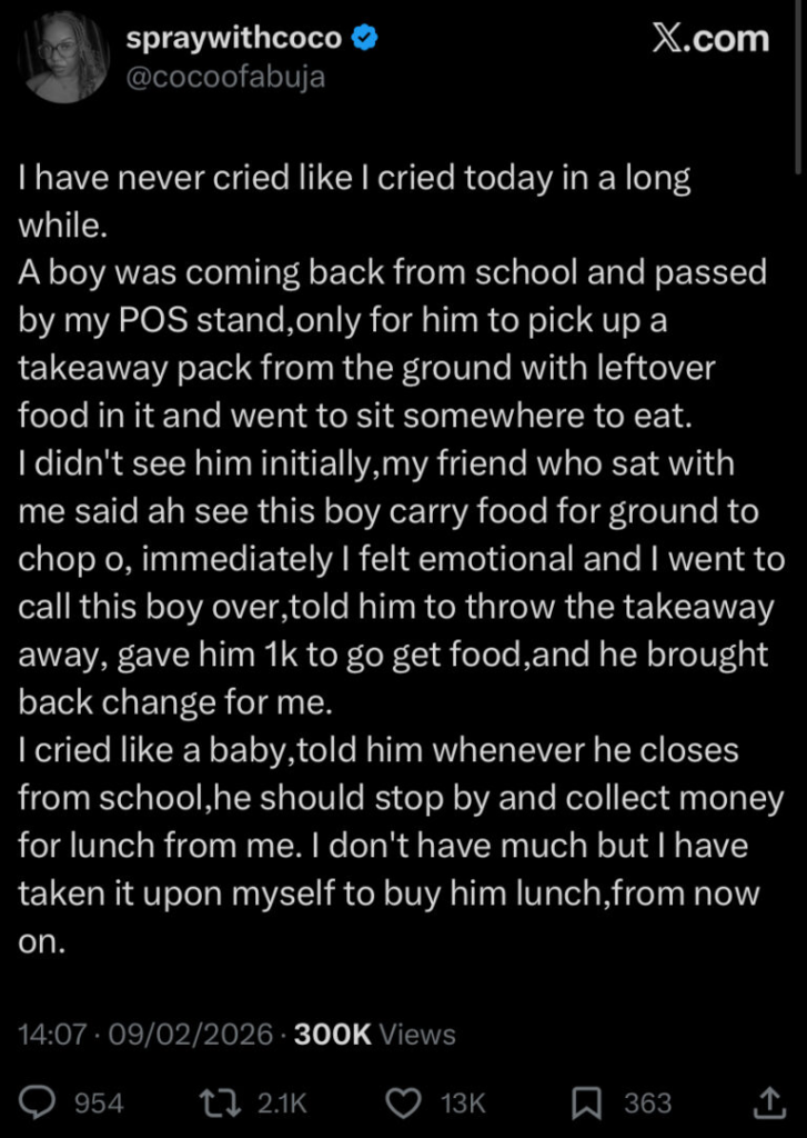 A young woman has moved social media to tears after recounting an emotional experience helping a young boy in need, describing how the encounter left her overwhelmed with emotion.