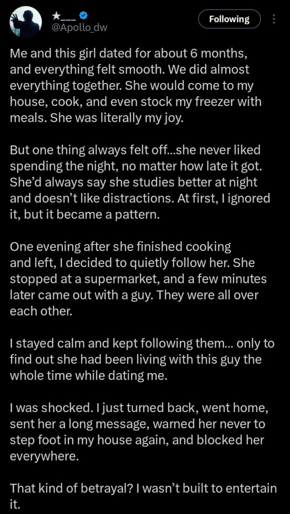 Social media users have flocked to comment, many expressing empathy and sharing their own stories of betrayal. Some have praised his courage in speaking out, while others have used the ordeal as a cautionary tale about red flags and relationship boundaries.