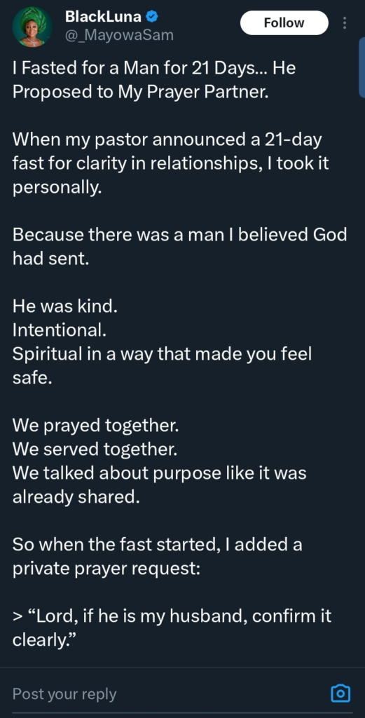 According to the lady, she undertook an intense period of fasting and prayer, believing her efforts would bring the man she loved closer to her. However, in a twist that has shocked many, the man instead proposed to her prayer partner, leaving her feeling betrayed and devastated.