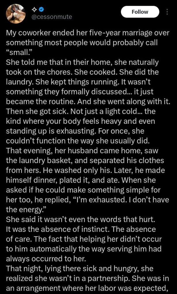 The woman explained that the lack of care wasn’t about grand romantic gestures — it was about everyday presence.