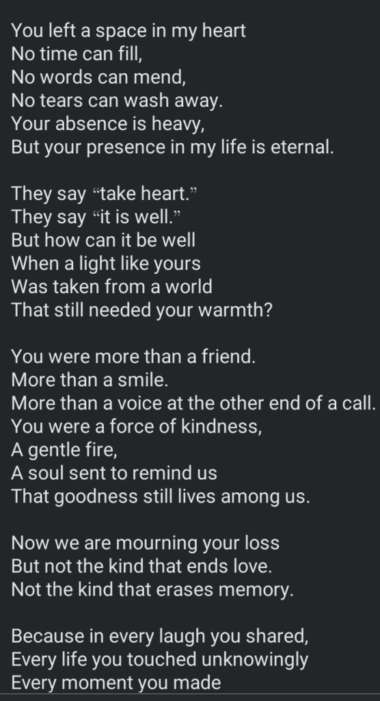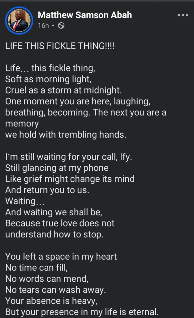 According to him, Ifunaya’s words were filled with wisdom and warmth, emphasizing love, care, and making the most of every opportunity. Tragically, her passing came sooner than expected, leaving friends and family grappling with grief and unanswered questions.