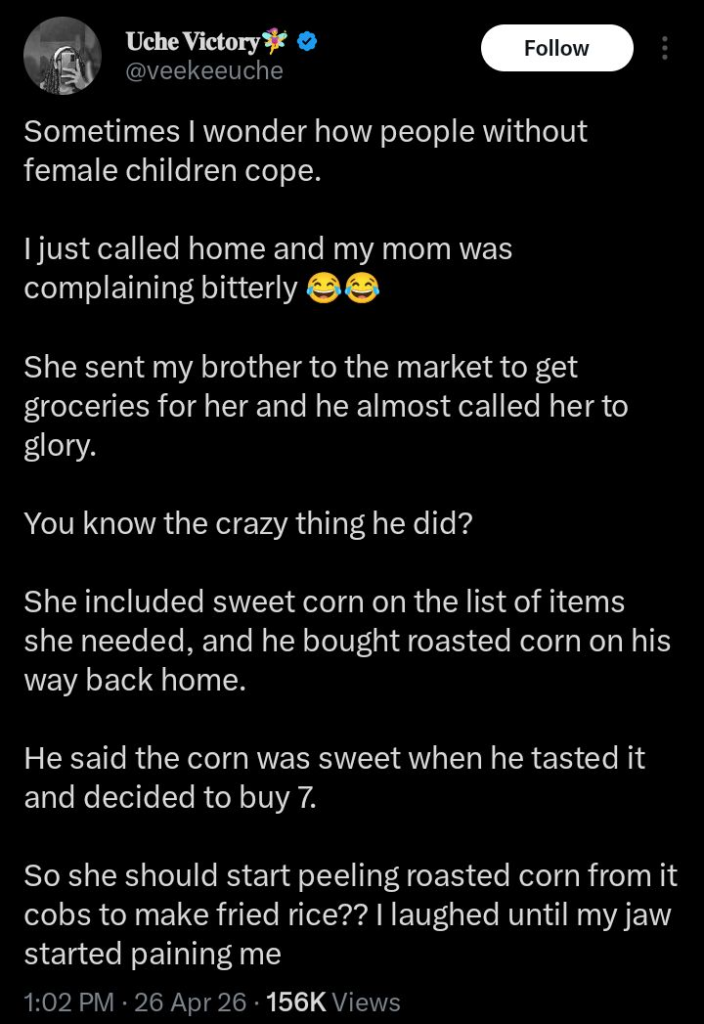 As reactions continue to pour in, many say the post highlights a familiar truth: in many homes, when things go wrong, it’s often the daughters who end up stepping in to fix the aftermath.