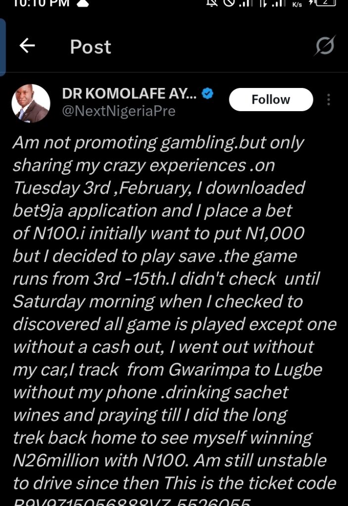 In a jaw-dropping turn of events, a man who placed a modest ₦100 bet on Bet9ja has seen his life change forever after winning an unexpected fortune. The bettor, who is still coming to grips with his unbelievable luck, described himself as “still unstable” after the surprise windfall.