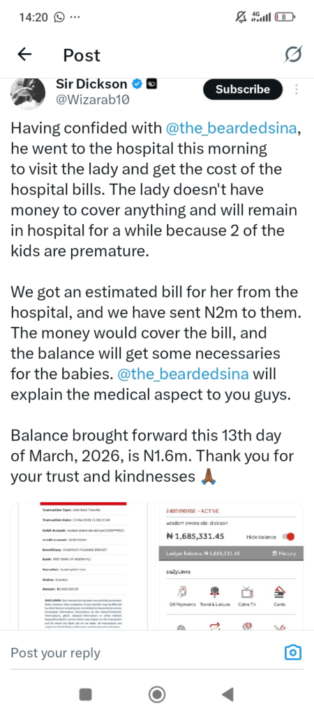An influencer, moved by the woman’s extraordinary circumstances, spearheaded a fundraising campaign that successfully raised ₦2 million to support her and her growing family. The campaign quickly gained traction online, with followers and well-wishers contributing to ensure the mother and her children would have the resources they need.
