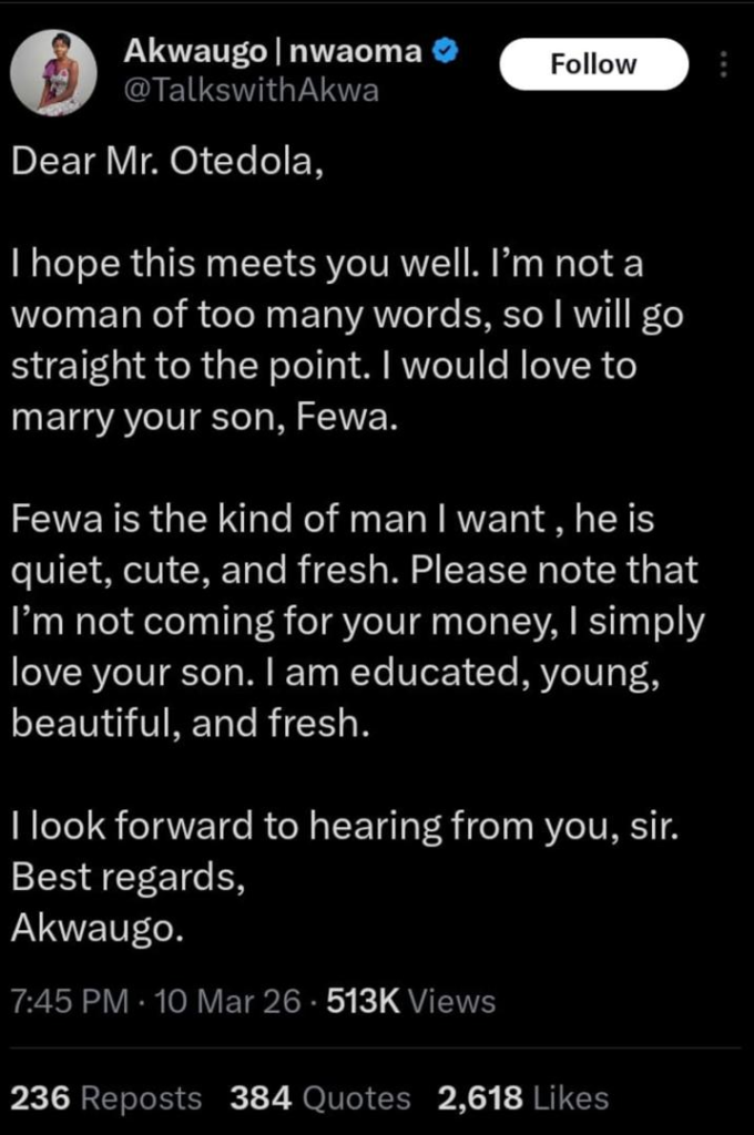 A young woman has set social media buzzing after publicly declaring her love for **Femi Otedola’s son, Fewa Otedola, in a dramatic open letter that has quickly gone viral online.