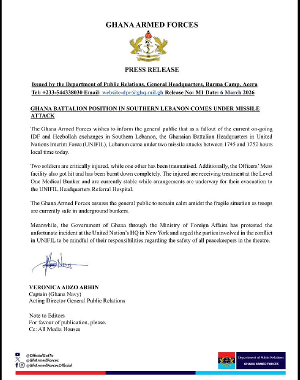 Two Ghanaian peacekeepers have been critically wounded after a missile attack slammed into their United Nations base in southern Lebanon, leaving the camp in chaos and sending shockwaves through Ghana’s military and diplomatic circles.