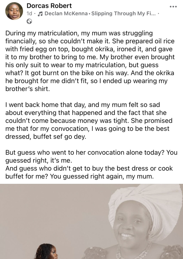 In a post that has touched thousands, the lady revealed how financial struggles robbed her of a moment she had always dreamed of sharing with her mother. Recalling her matriculation days, she disclosed that her mum couldn’t attend due to lack of money — a painful absence she says still lingers in her heart.