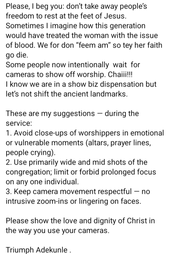 - Over-commercialization of worship content — She argued that excessive promotion of events, tithes, or donations online makes the church feel more like a business than a place of faith.