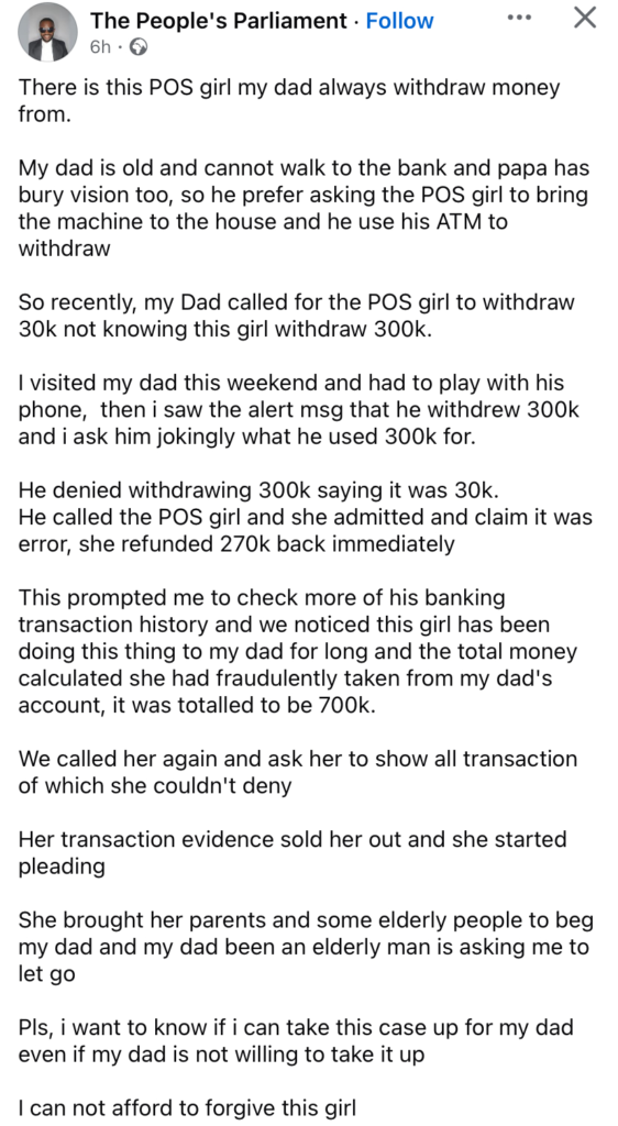 A shocking case of alleged fraud has rocked social media after reports surfaced that a young Point-of-Sale (POS) operator tricked an elderly man out of ₦700,000.