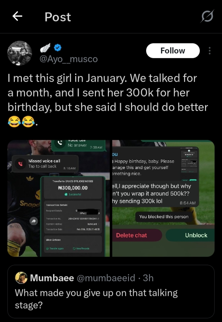 What started as a promising modern-day love story has ended in disappointment and disbelief after a man revealed he spent ₦300,000 on a woman he had only been in a “talking stage” with—only to receive an unexpected reaction on her birthday.