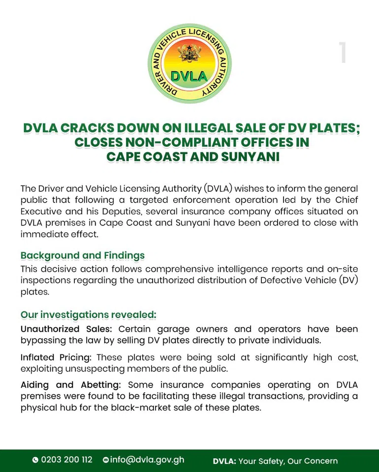 In a dramatic crackdown, the Driver and Vehicle Licensing Authority (DVLA) has shut down insurance offices in Cape Coast and Sunyani following investigations into the illegal sale of DV Plates. The move comes amid growing concerns about fraud, road safety, and regulatory violations in the country’s vehicle registration system.