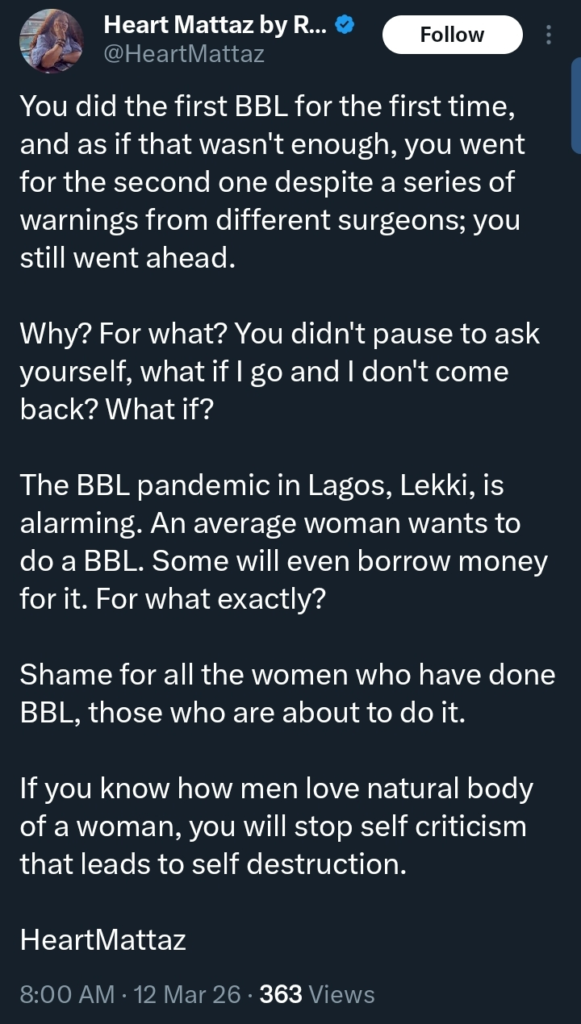 In a post that quickly went viral, the lady wrote, “Shame on all women doing BBL,” condemning the cosmetic procedure and expressing her view that such practices promote vanity and unrealistic beauty standards.