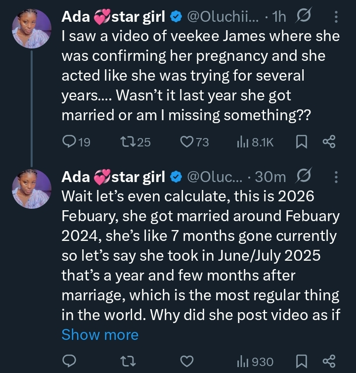 Social media is buzzing after a lady publicly reacted to Veekee James’ pregnancy announcement, claiming the fashion icon behaved as though she had been trying to conceive for several years. The comment has ignited heated reactions online, with fans rushing to defend Veekee while others debate the expectations placed on women and pregnancy narratives.