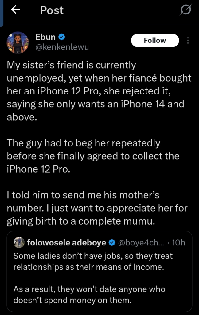 Drama, shock, and disbelief are sweeping social media after a woman revealed why her unemployed sister’s friend refused a gift that most would drool over: an iPhone 12 Pro from her boyfriend.