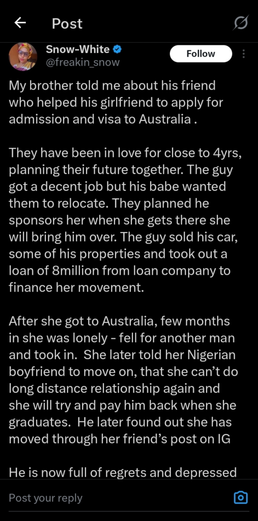 A heartbreaking story of love, sacrifice, and betrayal has stirred reactions online after a man reportedly took a massive ₦8 million loan to help his girlfriend travel overseas — only to be left with regret.