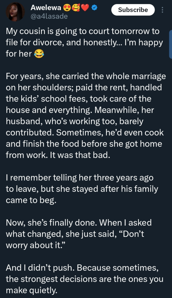 A bold and emotional statement has set social media abuzz after a woman openly expressed joy over her cousin’s decision to end her marriage.
