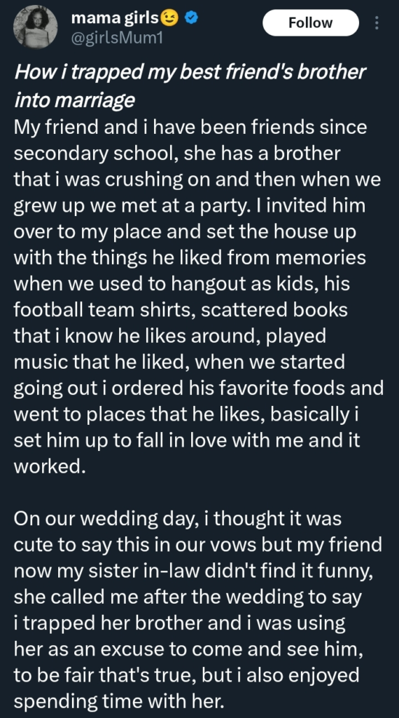 According to her confession, she deliberately pursued and “trapped” her best friend’s brother into marriage, a decision she admits was calculated—but one that has now backfired spectacularly. The twist? Her sister-in-law is furious, accusing her of betrayal and scheming, leaving family dinners tense and friendships on the line.