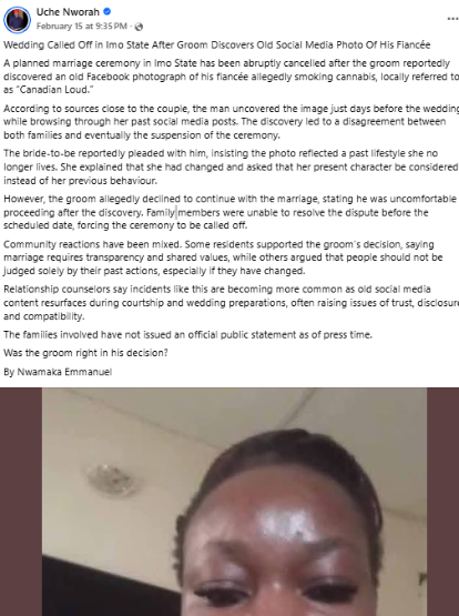 What was meant to be a joyful union turned into a scene of disbelief and heartbreak in Imo State after a groom reportedly called off his wedding upon stumbling across an old social media photo of his bride-to-be.