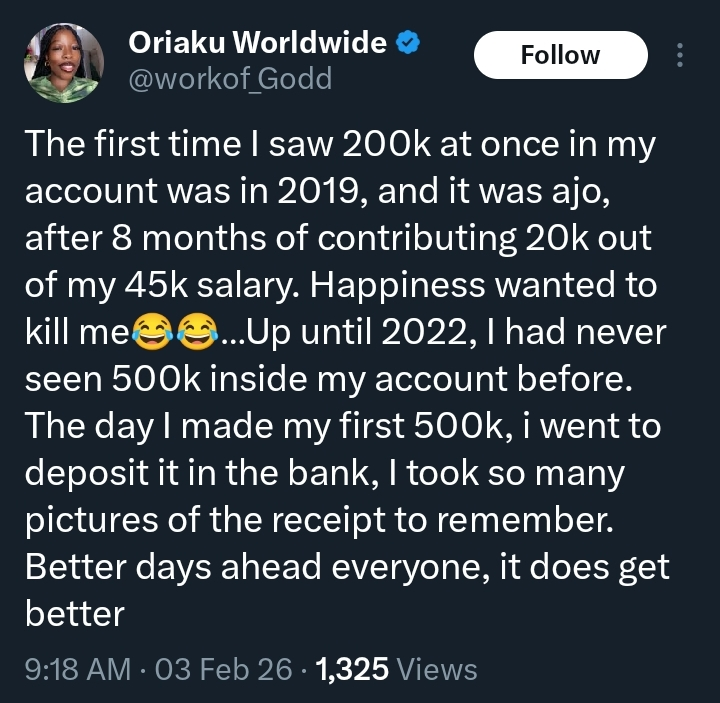 A young woman has captured the hearts and imaginations of social media users after sharing the electrifying story of how she earned her first ₦200,000, describing the experience as life-changing, empowering, and unforgettable.