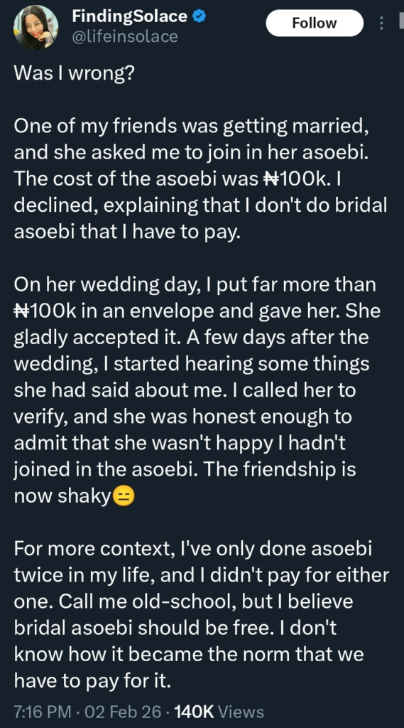 According to the lady, when her friend announced her wedding, she showed support by sending over ₦100,000 in cash to help with preparations. However, things took a turn when she was later asked to buy an expensive asoebi outfit, which she felt was unnecessary given her earlier contribution.