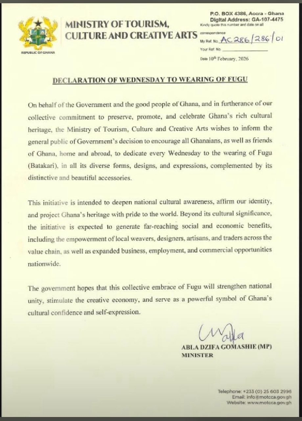The directive encourages public servants — and by extension all Ghanaians — to proudly wear Fugu, the iconic handwoven fabric from Northern Ghana, as a symbol of national identity and cultural pride.