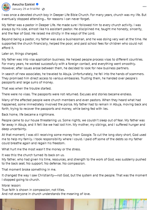 A former member of Deeper Life Church has stirred controversy and sparked debate after revealing why he stopped attending services, bluntly stating:
