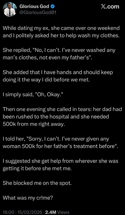 A storm of outrage and heated debate has erupted online after a man revealed he refused to give his ex-girlfriend ₦500,000 for her father’s medical treatment — and now he’s asking one burning question: “What was my crime?”